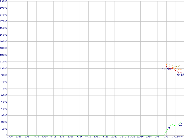 ※このグラフは過去のデータも税率5%相当に調整した税込み相当額のグラフです。 税率変更や、総額表示方式導入(2004年4月)の影響は除いています。 | | | ●凡例 | 最安値 (点線部は販売店未確認 または未調査) | 平均値 | 最高値 | ショップ数 |
