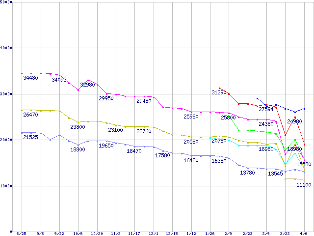 | Socket AM2 (FSB 1000MHz,Dual Core,TDP65W)の最安値推移 | | | (2006年8月25日~2007年4月6日) |