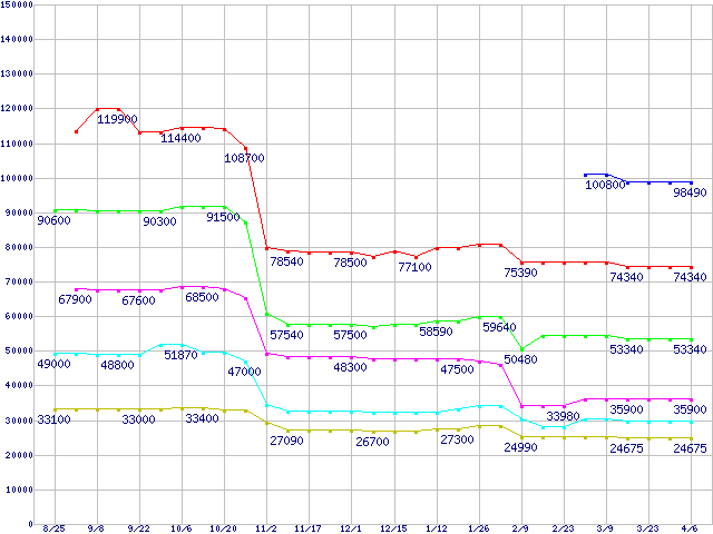 | Socket F (FSB 1000MHz,L2 1MBx2,Dual Core,TDP 95W)の最安値推移 | | | (2006年8月25日~2007年4月6日) |
