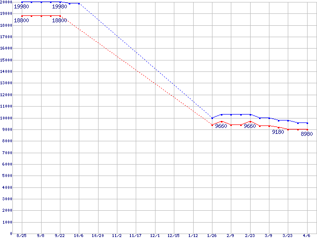 | LGA775 (FSB 800MHz,L2 2MB,Hyper-Threading,EM64T対応)の最安値推移 | | | (2006年8月25日~2007年4月6日) |