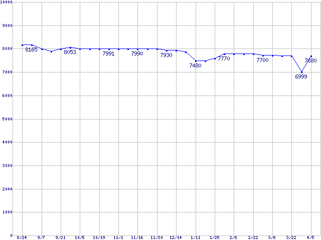 | WD Caviar[Special Edition] (7200rpm,Ultra ATA/100,8MB)の最安値推移 | | | (2006年8月24日~2007年4月5日) |