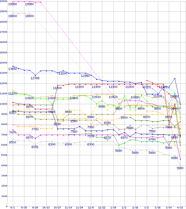 | CPU主要製品(最安値1万円未満)の最安値推移 | | | (2006年9月1日~2007年4月13日) |