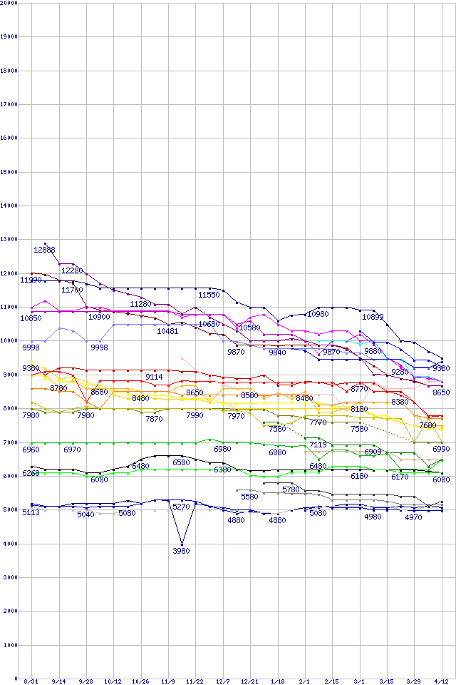 | HDD主要製品(最安値1万円未満)の最安値推移 | | | (2006年8月31日~2007年4月12日) |