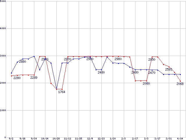 メモリ主要製品(最安値5千円未満)の最安値推移