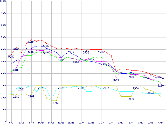 メモリ主要製品(最安値5千円未満)の最安値推移