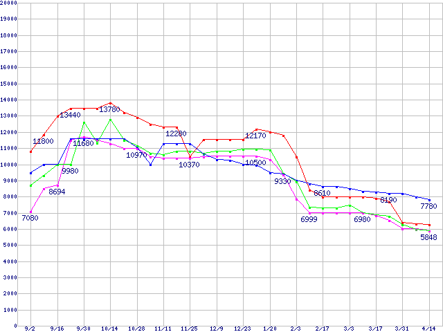 メモリ主要製品(最安値1万円以上)の最安値推移