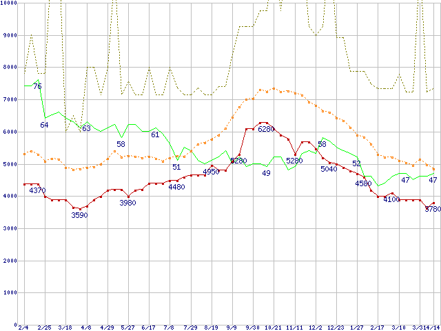 ※このグラフは過去のデータも税率5%相当に調整した税込み相当額のグラフです。 税率変更や、総額表示方式導入(2004年4月)の影響は除いています。 | | | ●凡例 | 最安値 (点線部は販売店未確認 または未調査) | 平均値 | 最高値 | ショップ数 |