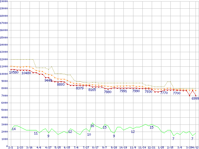 ※このグラフは過去のデータも税率5%相当に調整した税込み相当額のグラフです。 税率変更や、総額表示方式導入(2004年4月)の影響は除いています。 | | | ●凡例 | 最安値 (点線部は販売店未確認 または未調査) | 平均値 | 最高値 | ショップ数 |