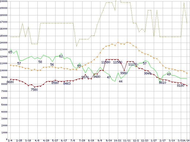 ※このグラフは過去のデータも税率5%相当に調整した税込み相当額のグラフです。 税率変更や、総額表示方式導入(2004年4月)の影響は除いています。 | | | ●凡例 | 最安値 (点線部は販売店未確認 または未調査) | 平均値 | 最高値 | ショップ数 |