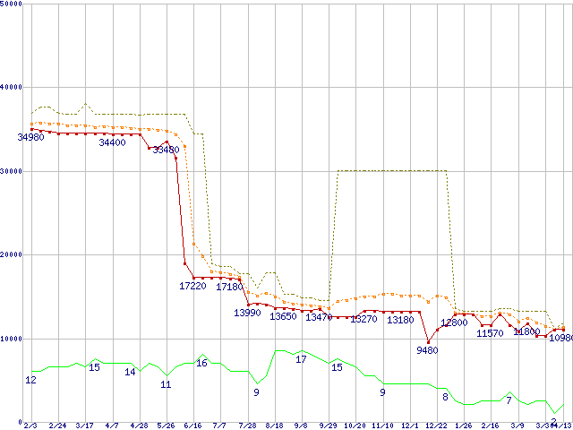 ※このグラフは過去のデータも税率5%相当に調整した税込み相当額のグラフです。 税率変更や、総額表示方式導入(2004年4月)の影響は除いています。 | | | ●凡例 | 最安値 (点線部は販売店未確認 または未調査) | 平均値 | 最高値 | ショップ数 |
