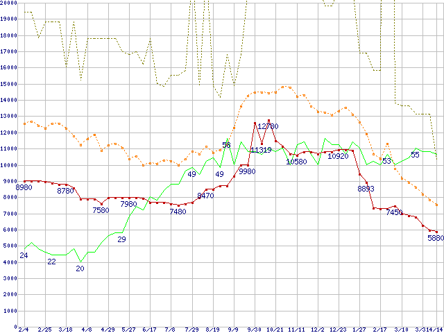 ※このグラフは過去のデータも税率5%相当に調整した税込み相当額のグラフです。 税率変更や、総額表示方式導入(2004年4月)の影響は除いています。 | | | ●凡例 | 最安値 (点線部は販売店未確認 または未調査) | 平均値 | 最高値 | ショップ数 |