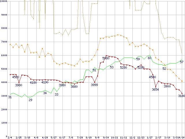 ※このグラフは過去のデータも税率5%相当に調整した税込み相当額のグラフです。 税率変更や、総額表示方式導入(2004年4月)の影響は除いています。 | | | ●凡例 | 最安値 (点線部は販売店未確認 または未調査) | 平均値 | 最高値 | ショップ数 |