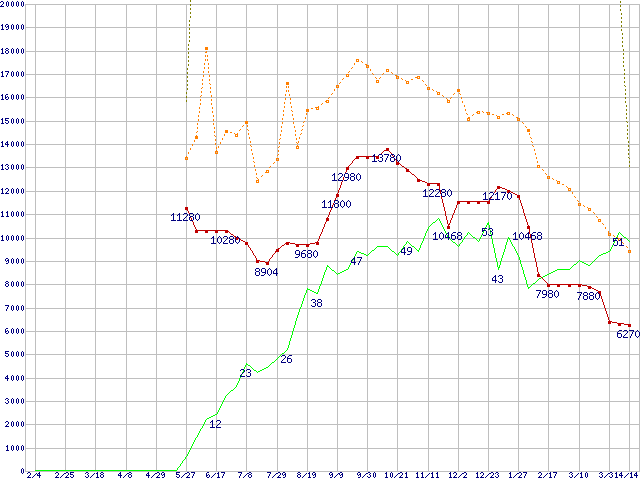 ※このグラフは過去のデータも税率5%相当に調整した税込み相当額のグラフです。 税率変更や、総額表示方式導入(2004年4月)の影響は除いています。 | | | ●凡例 | 最安値 (点線部は販売店未確認 または未調査) | 平均値 | 最高値 | ショップ数 |