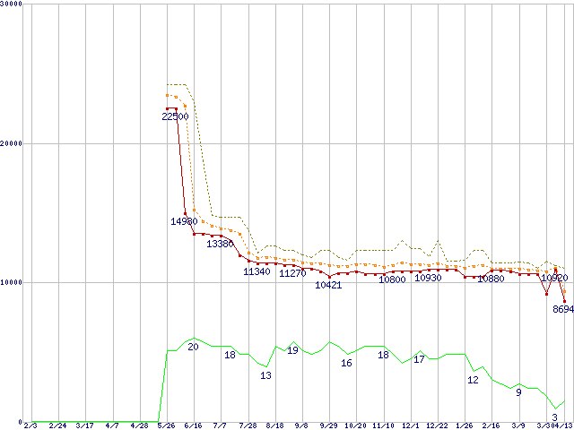 | Athlon 64 3500+ (2.2GHz,L2 512KB)の価格推移 | | | (2006年2月3日~2007年4月13日) |