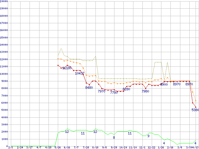 | Sempron 3400+ (1.8GHz,L2 256KB)の価格推移 | | | (2006年2月3日~2007年4月13日) |