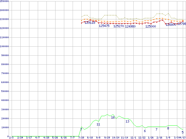 ※このグラフは過去のデータも税率5%相当に調整した税込み相当額のグラフです。 税率変更や、総額表示方式導入(2004年4月)の影響は除いています。 | | | ●凡例 | 最安値 (点線部は販売店未確認 または未調査) | 平均値 | 最高値 | ショップ数 |