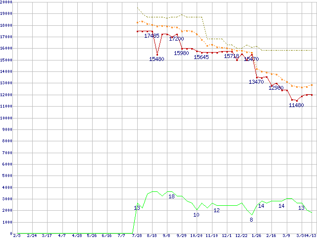 ※このグラフは過去のデータも税率5%相当に調整した税込み相当額のグラフです。 税率変更や、総額表示方式導入(2004年4月)の影響は除いています。 | | | ●凡例 | 最安値 (点線部は販売店未確認 または未調査) | 平均値 | 最高値 | ショップ数 |