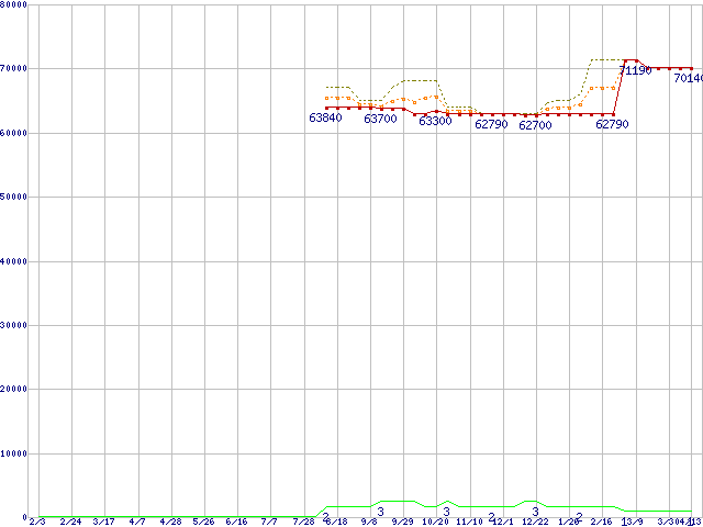 ※このグラフは過去のデータも税率5%相当に調整した税込み相当額のグラフです。 税率変更や、総額表示方式導入(2004年4月)の影響は除いています。 | | | ●凡例 | 最安値 (点線部は販売店未確認 または未調査) | 平均値 | 最高値 | ショップ数 |