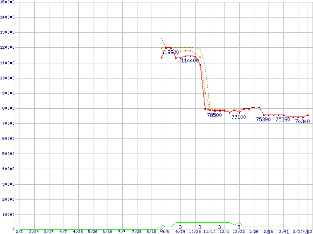 ※このグラフは過去のデータも税率5%相当に調整した税込み相当額のグラフです。 税率変更や、総額表示方式導入(2004年4月)の影響は除いています。 | | | ●凡例 | 最安値 (点線部は販売店未確認 または未調査) | 平均値 | 最高値 | ショップ数 |