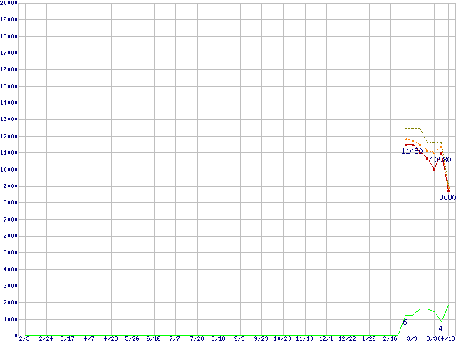※このグラフは過去のデータも税率5%相当に調整した税込み相当額のグラフです。 税率変更や、総額表示方式導入(2004年4月)の影響は除いています。 | | | ●凡例 | 最安値 (点線部は販売店未確認 または未調査) | 平均値 | 最高値 | ショップ数 |