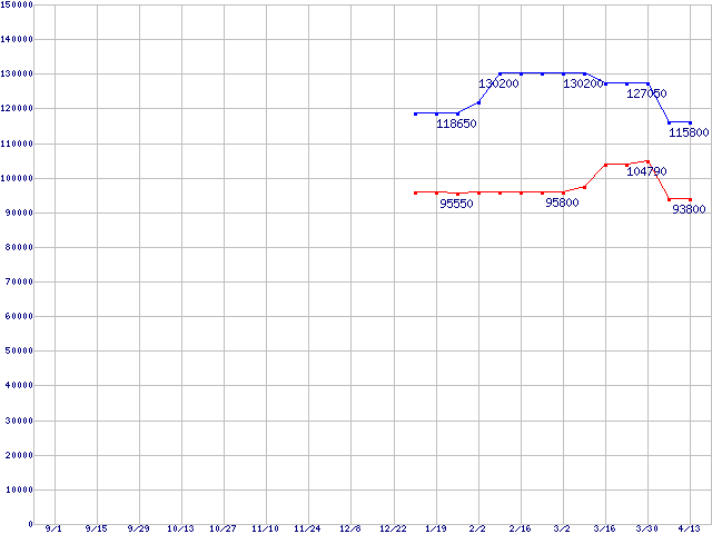 | LGA771(FSB 1333MHz,Quad Core,L2 4MB×2,TDP 80W)の最安値推移 | | | (2006年9月1日~2007年4月13日) |