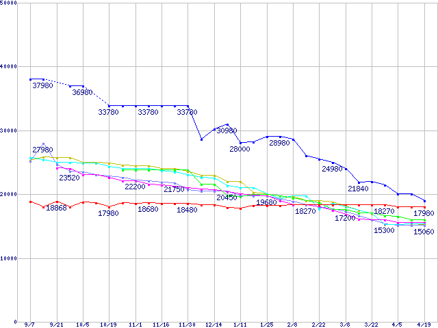 HDD主要製品(最安値1万5千円~2万円未満)の最安値推移