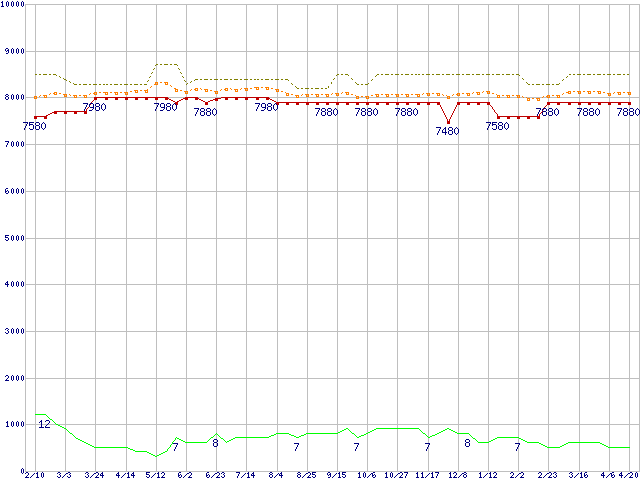 ※このグラフは過去のデータも税率5%相当に調整した税込み相当額のグラフです。 税率変更や、総額表示方式導入(2004年4月)の影響は除いています。 | | | ●凡例 | 最安値 (点線部は販売店未確認 または未調査) | 平均値 | 最高値 | ショップ数 |