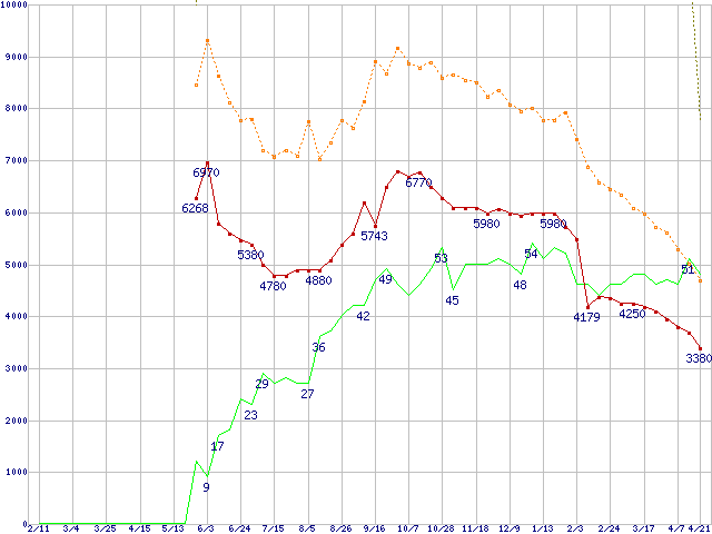 ※このグラフは過去のデータも税率5%相当に調整した税込み相当額のグラフです。 税率変更や、総額表示方式導入(2004年4月)の影響は除いています。 | | | ●凡例 | 最安値 (点線部は販売店未確認 または未調査) | 平均値 | 最高値 | ショップ数 |