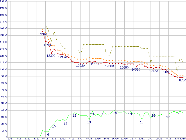 ※このグラフは過去のデータも税率5%相当に調整した税込み相当額のグラフです。 税率変更や、総額表示方式導入(2004年4月)の影響は除いています。 | | | ●凡例 | 最安値 (点線部は販売店未確認 または未調査) | 平均値 | 最高値 | ショップ数 |