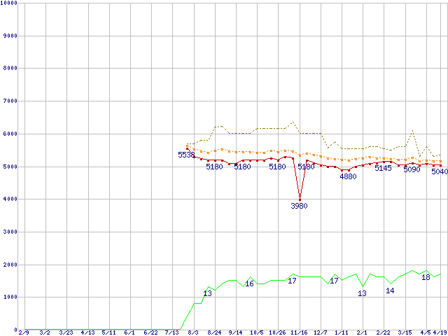 ※このグラフは過去のデータも税率5%相当に調整した税込み相当額のグラフです。 税率変更や、総額表示方式導入(2004年4月)の影響は除いています。 | | | ●凡例 | 最安値 (点線部は販売店未確認 または未調査) | 平均値 | 最高値 | ショップ数 |