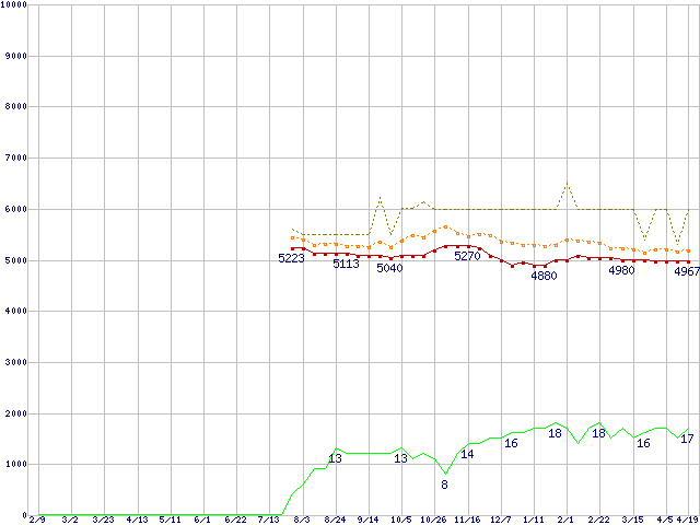 ※このグラフは過去のデータも税率5%相当に調整した税込み相当額のグラフです。 税率変更や、総額表示方式導入(2004年4月)の影響は除いています。 | | | ●凡例 | 最安値 (点線部は販売店未確認 または未調査) | 平均値 | 最高値 | ショップ数 |