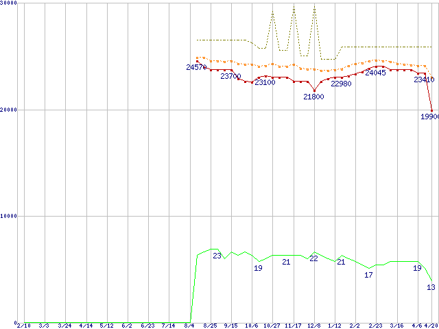 ※このグラフは過去のデータも税率5%相当に調整した税込み相当額のグラフです。 税率変更や、総額表示方式導入(2004年4月)の影響は除いています。 | | | ●凡例 | 最安値 (点線部は販売店未確認 または未調査) | 平均値 | 最高値 | ショップ数 |