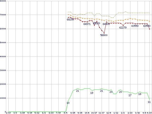 | Core 2 Duo E6700 (2.66GHz,L2 4MB)の価格推移 | | | (2006年2月10日~2007年4月20日) |