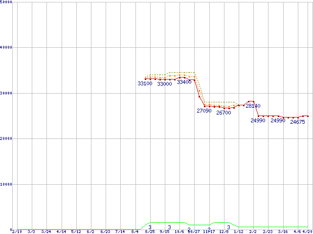 ※このグラフは過去のデータも税率5%相当に調整した税込み相当額のグラフです。 税率変更や、総額表示方式導入(2004年4月)の影響は除いています。 | | | ●凡例 | 最安値 (点線部は販売店未確認 または未調査) | 平均値 | 最高値 | ショップ数 |