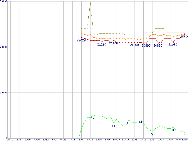 ※このグラフは過去のデータも税率5%相当に調整した税込み相当額のグラフです。 税率変更や、総額表示方式導入(2004年4月)の影響は除いています。 | | | ●凡例 | 最安値 (点線部は販売店未確認 または未調査) | 平均値 | 最高値 | ショップ数 |