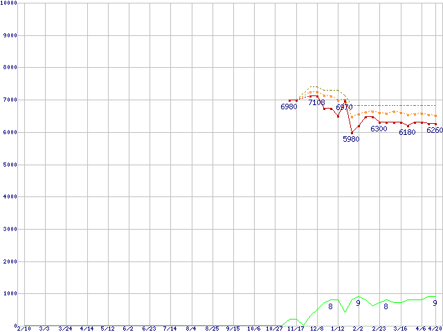 ※このグラフは過去のデータも税率5%相当に調整した税込み相当額のグラフです。 税率変更や、総額表示方式導入(2004年4月)の影響は除いています。 | | | ●凡例 | 最安値 (点線部は販売店未確認 または未調査) | 平均値 | 最高値 | ショップ数 |