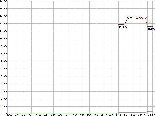 ※このグラフは過去のデータも税率5%相当に調整した税込み相当額のグラフです。 税率変更や、総額表示方式導入(2004年4月)の影響は除いています。 | | | ●凡例 | 最安値 (点線部は販売店未確認 または未調査) | 平均値 | 最高値 | ショップ数 |