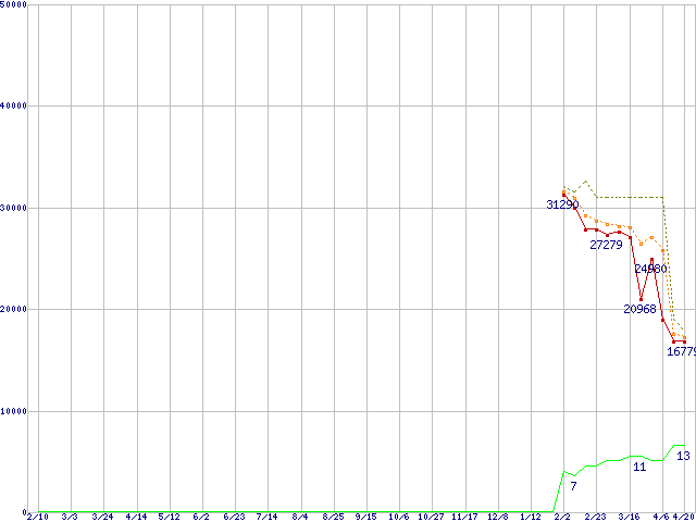 | Athlon 64 X2 4800+ (2.5GHz,L2 512KB×2,TDP65W)の価格推移 | | | (2006年2月10日~2007年4月20日) |