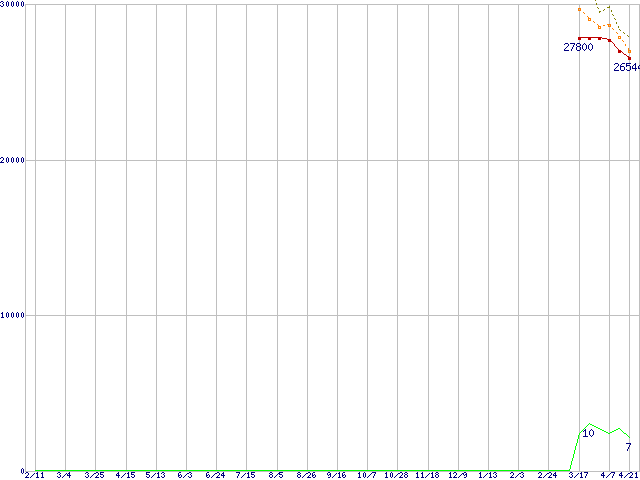 ※このグラフは過去のデータも税率5%相当に調整した税込み相当額のグラフです。 税率変更や、総額表示方式導入(2004年4月)の影響は除いています。 | | | ●凡例 | 最安値 (点線部は販売店未確認 または未調査) | 平均値 | 最高値 | ショップ数 |