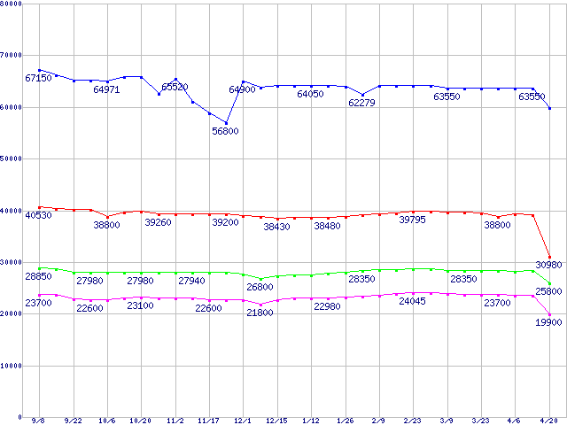 | LGA775 (FSB 1066MHz,Dual Core,EM64T対応,TDP 65W)の最安値推移 | | | (2006年9月8日~2007年4月20日) |