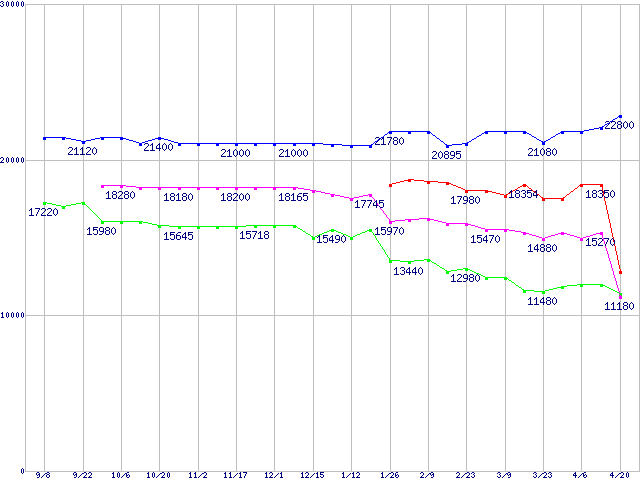 | LGA775 (FSB 800MHz,L2 2MB×2,Dual Core,EM64T対応)の最安値推移 | | | (2006年9月8日~2007年4月20日) |
