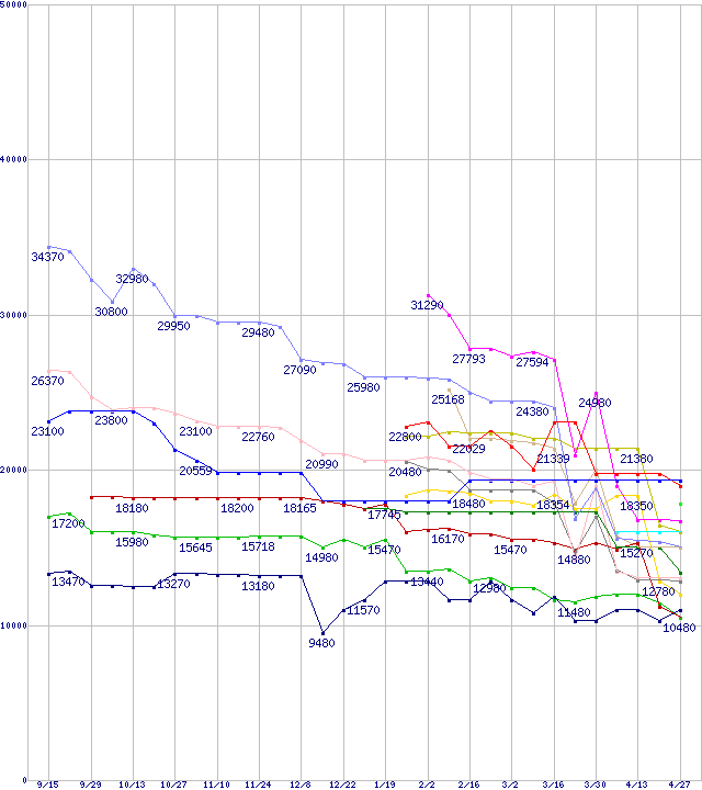 | CPU主要製品(最安値1万円~2万円未満)の最安値推移 | | | (2006年9月15日~2007年4月27日) |