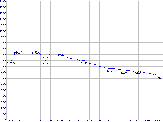 | メモリ主要製品(最安値5千円~1万円未満)の最安値推移 | | | (2006年9月16日~2007年4月28日) |