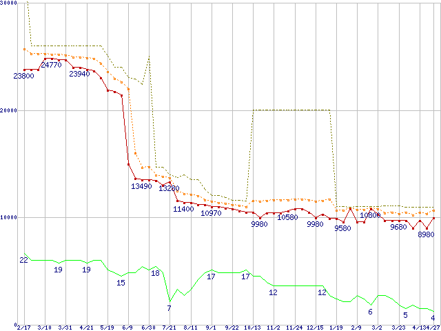 ※このグラフは過去のデータも税率5%相当に調整した税込み相当額のグラフです。 税率変更や、総額表示方式導入(2004年4月)の影響は除いています。 | | | ●凡例 | 最安値 (点線部は販売店未確認 または未調査) | 平均値 | 最高値 | ショップ数 |