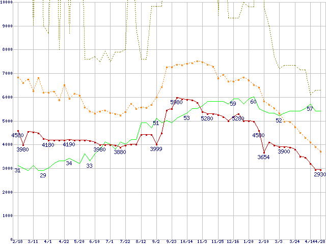 ※このグラフは過去のデータも税率5%相当に調整した税込み相当額のグラフです。 税率変更や、総額表示方式導入(2004年4月)の影響は除いています。 | | | ●凡例 | 最安値 (点線部は販売店未確認 または未調査) | 平均値 | 最高値 | ショップ数 |