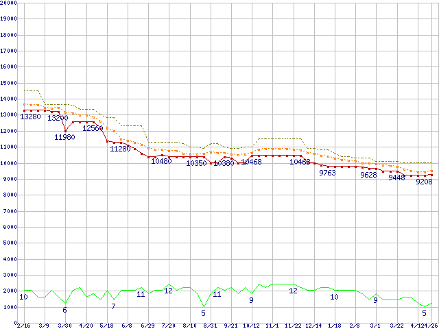 ※このグラフは過去のデータも税率5%相当に調整した税込み相当額のグラフです。 税率変更や、総額表示方式導入(2004年4月)の影響は除いています。 | | | ●凡例 | 最安値 (点線部は販売店未確認 または未調査) | 平均値 | 最高値 | ショップ数 |