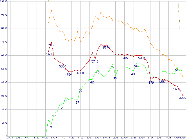※このグラフは過去のデータも税率5%相当に調整した税込み相当額のグラフです。 税率変更や、総額表示方式導入(2004年4月)の影響は除いています。 | | | ●凡例 | 最安値 (点線部は販売店未確認 または未調査) | 平均値 | 最高値 | ショップ数 |