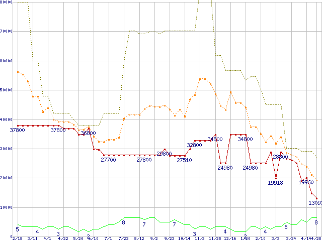 ※このグラフは過去のデータも税率5%相当に調整した税込み相当額のグラフです。 税率変更や、総額表示方式導入(2004年4月)の影響は除いています。 | | | ●凡例 | 最安値 (点線部は販売店未確認 または未調査) | 平均値 | 最高値 | ショップ数 |