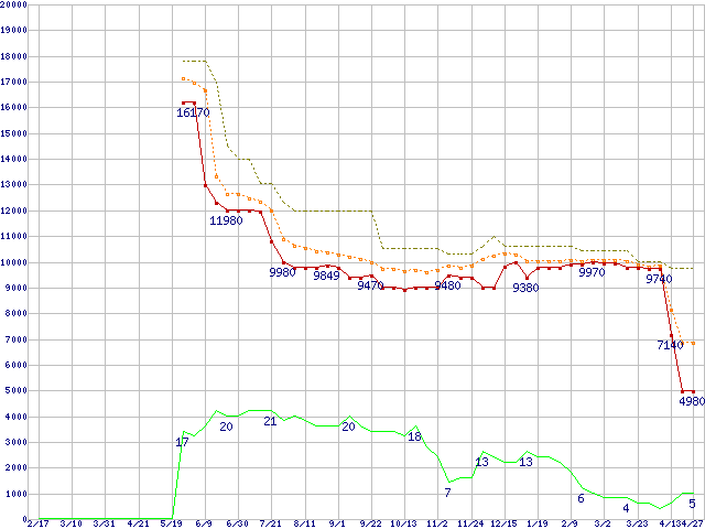 | Athlon 64 3200+ (2.0GHz,L2 512KB)の価格推移 | | | (2006年2月17日~2007年4月27日) |