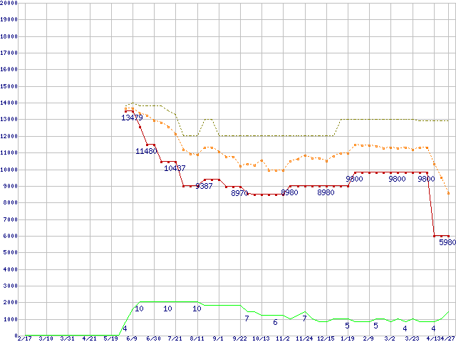 ※このグラフは過去のデータも税率5%相当に調整した税込み相当額のグラフです。 税率変更や、総額表示方式導入(2004年4月)の影響は除いています。 | | | ●凡例 | 最安値 (点線部は販売店未確認 または未調査) | 平均値 | 最高値 | ショップ数 |